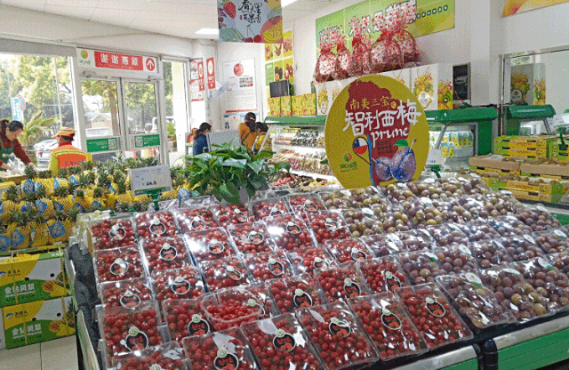 新店(diàn)整齊擺放(fàng)著(zhe)來(lái)自(zì)世界各地(dì)的(de)新鮮水(shuǐ)果