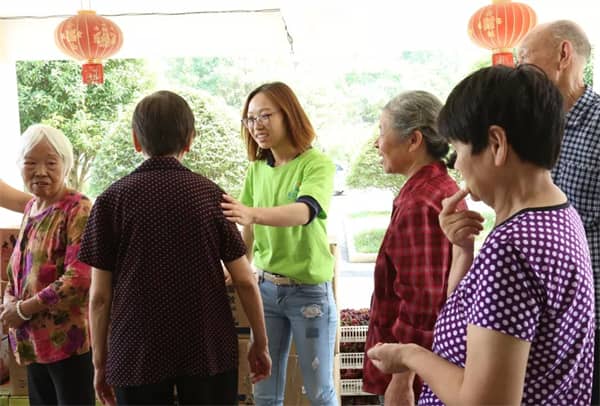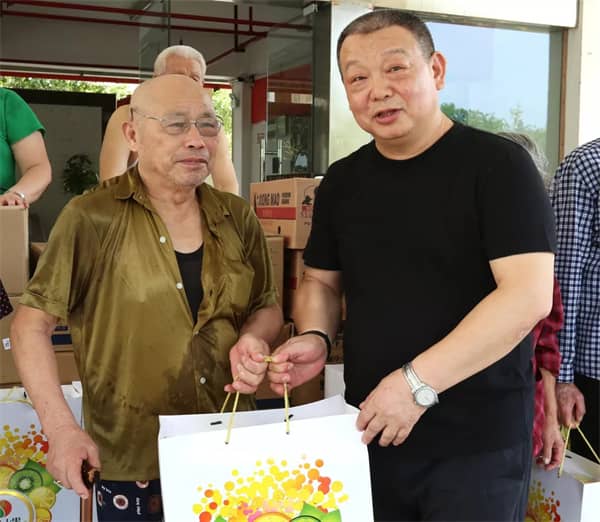 綠(lǜ)葉果業(yè)集團總經理(lǐ)唐紅(hóng)給敬老(lǎo)院的(de)老(lǎo)人(rén)們發鮮果、月(yu✔è)餅禮盒