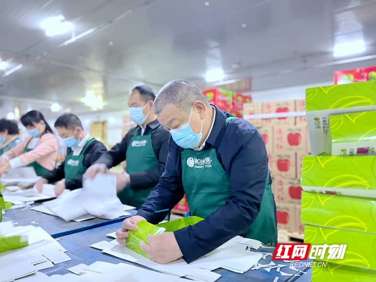 唐紅(hóng)(右一(yī))正在為(wèi)捐贈的(de)水(shuǐ)果打包