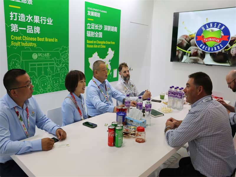( 綠(lǜ)葉水(shuǐ)果總經理(lǐ)唐紅(hóng)與國(guó)際客商熱(rè)情交談中)