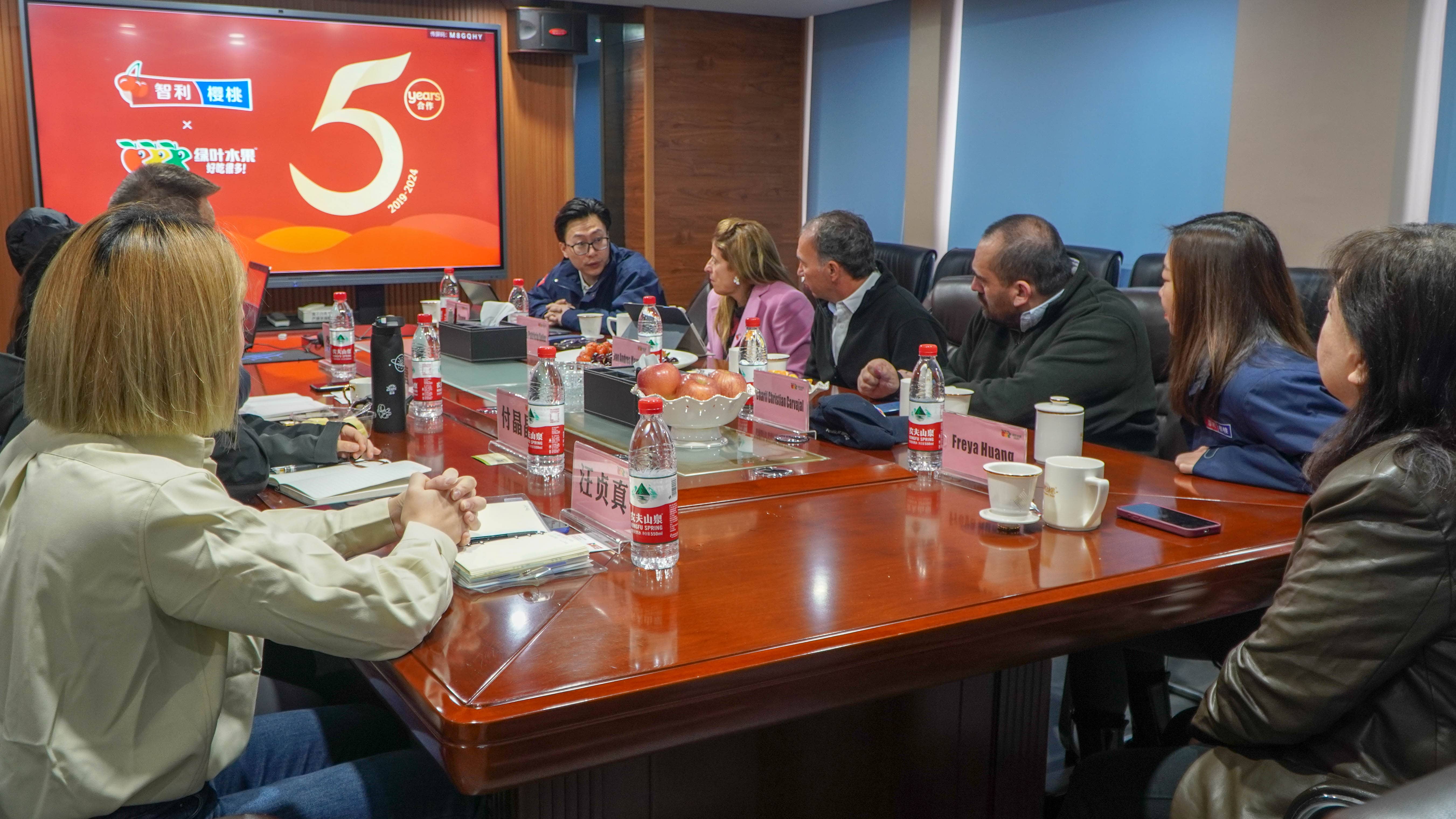 1月(yuè)18日(rì),智利水(shuǐ)果出口商協會(huì)會(huì)長(cháng)伊萬·瑪蘭姆比奧、櫻桃委員(yuá∏n)會(huì)總監科(kē)勞迪亞、歐亞市(shì)場(chǎng)總監夏瑞夫等一(yī)行(xí∞ng)到(dào)訪綠(lǜ)葉水(shuǐ)果并參觀交流,綠(lǜ)葉水(shuǐ)果總經理(lǐ)唐紅(hóng)陪同接待。