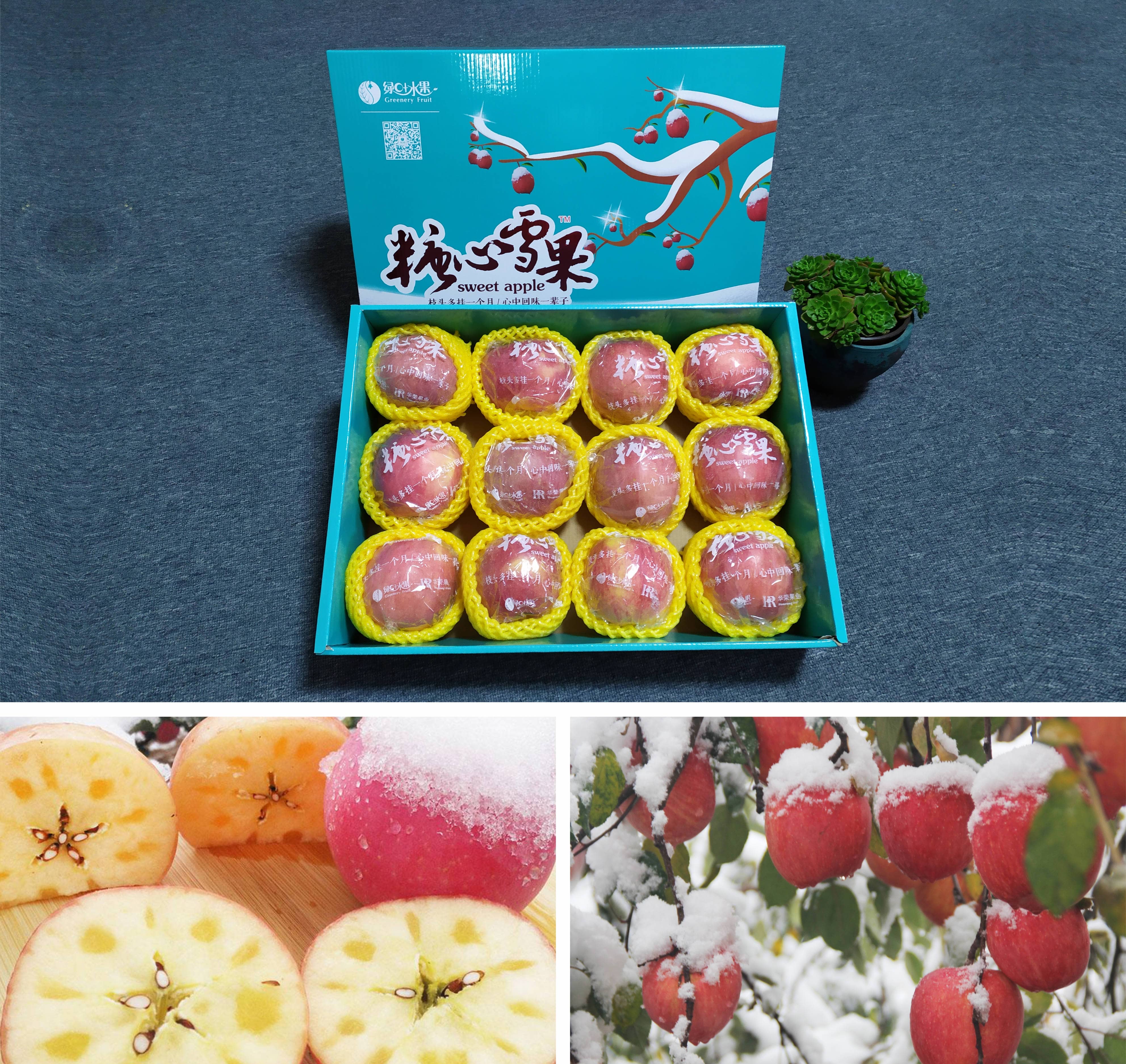 糖心雪(xuě)果,相(xiàng)比普通(tōng)蘋果晚采摘30多(duō)天,讓蘋果真正實現(xiàn)了(le)樹(shù)上(shàng)熟。γ在曆經大(dà)溫差、長(cháng)日(rì)曬、強風(fēng)吹洗禮的(de)條件(jiàn)下(xià),蘋果口感更佳,果香更濃郁,味道(dàβo)更甜,平均甜度在16~17度。切開(kāi)果肉可(kě)見(jiàn)糖心,非常受消費(fèi)者歡迎。